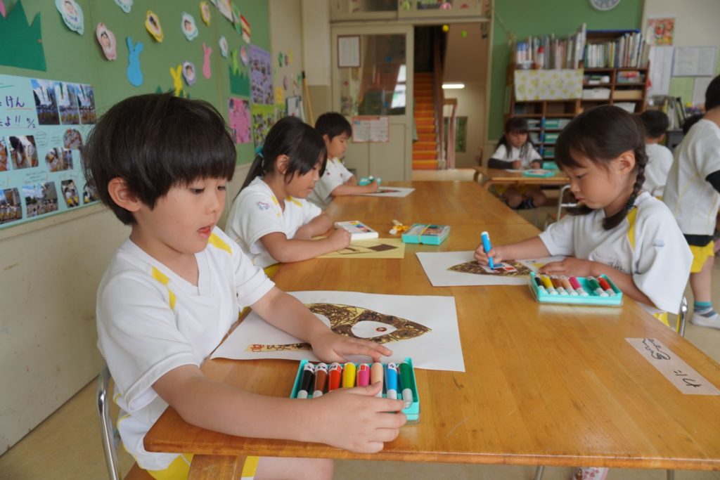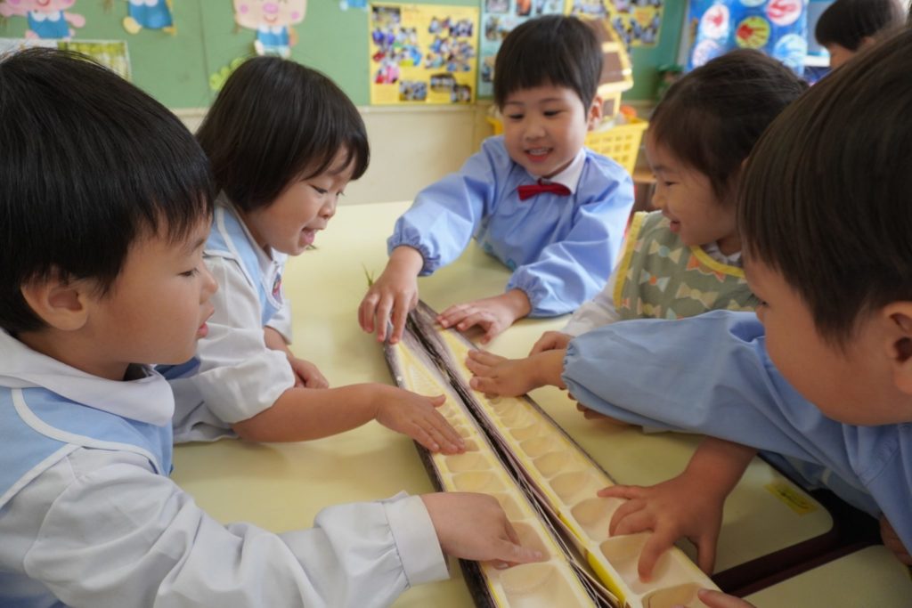 中はどうなっているのだろう?さっそく半分に切って観察しました。せっかくだから他の学年のお友達にも見てもらいましょうね。