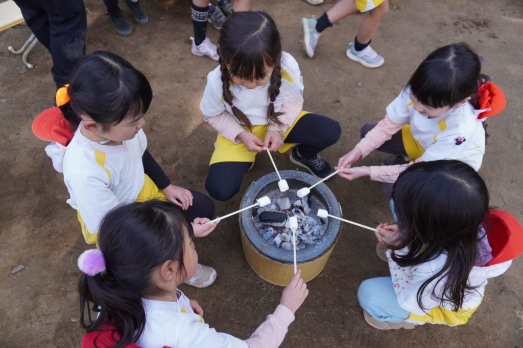 お山でマシュマロを焼いて食べました。みんなとっても楽しそう!