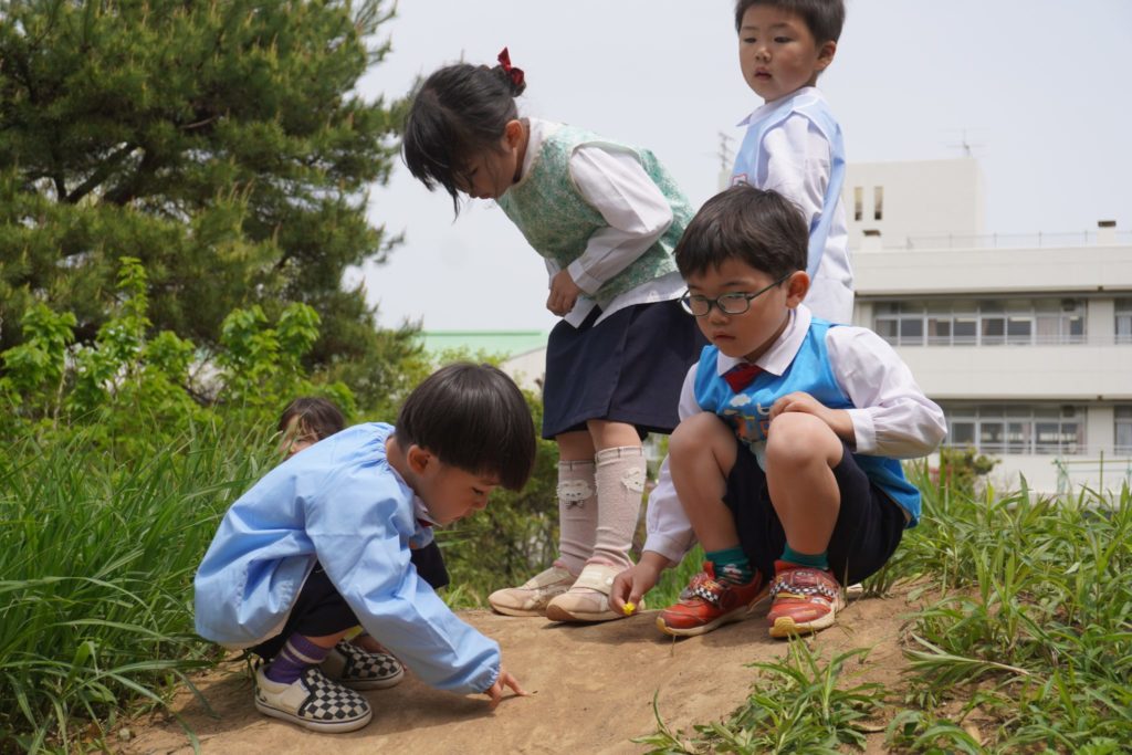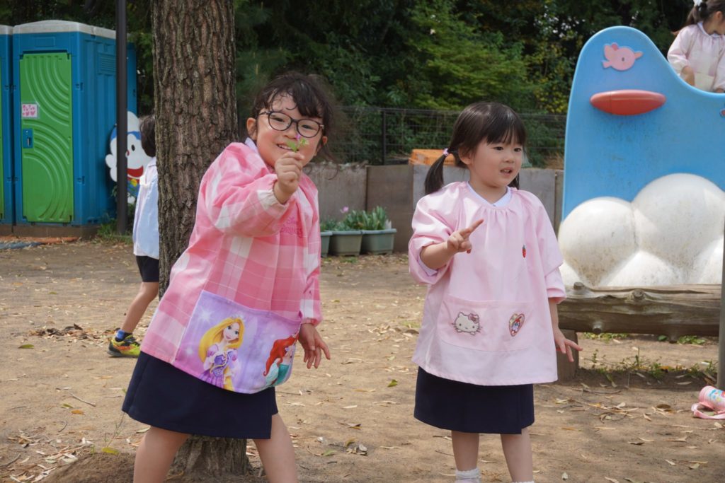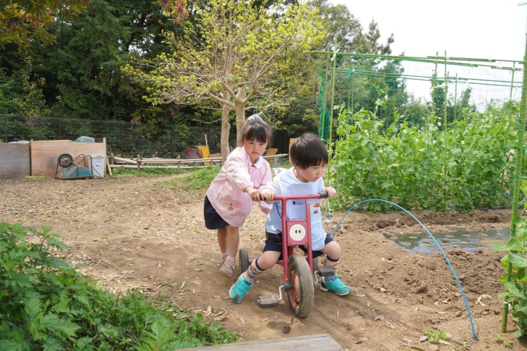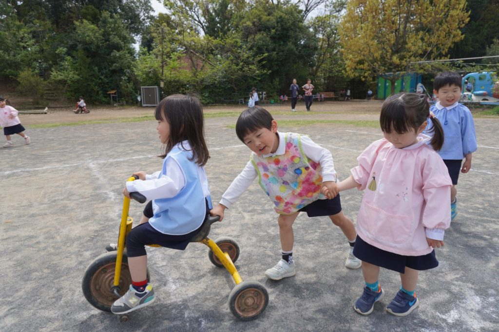 年長さんと一緒にお山の階段をのぼって楽しく遊びました。優しく遊び方を教えてくれたり、三輪車の後ろを押してくれたり、とっても仲良しになりました。