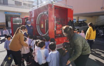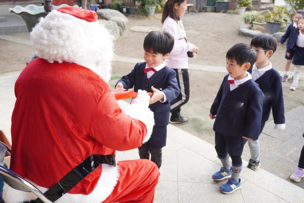 終業式のお話が終わると、どこからか鈴の音が聞こえて来ました。園庭に出てみるとサンタさんが おみやげを持って来てくれました。