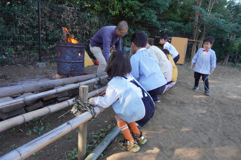 日曜日に降った雪がお山にはたくさん残っていて楽しく遊んだ年長さん。冷たくなった手は園長先生のたき火で温まります。